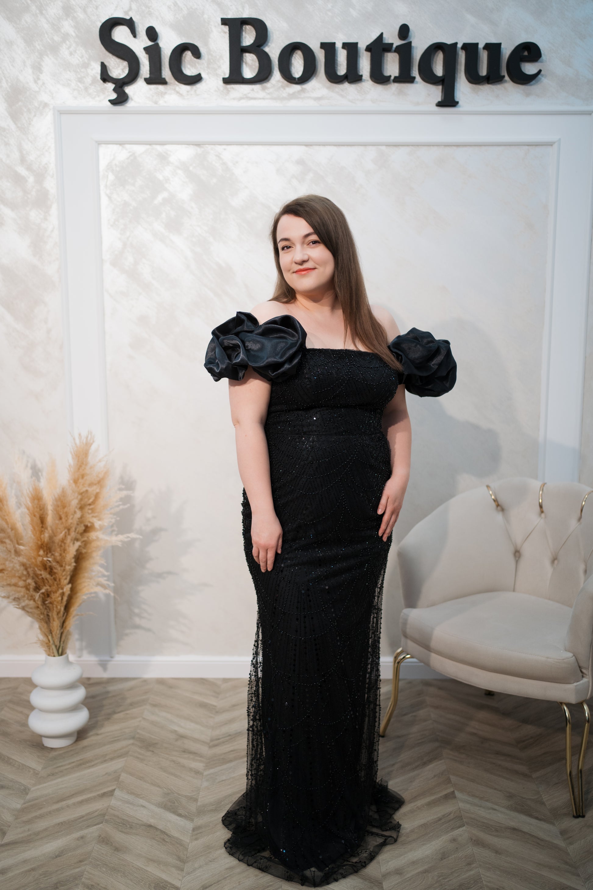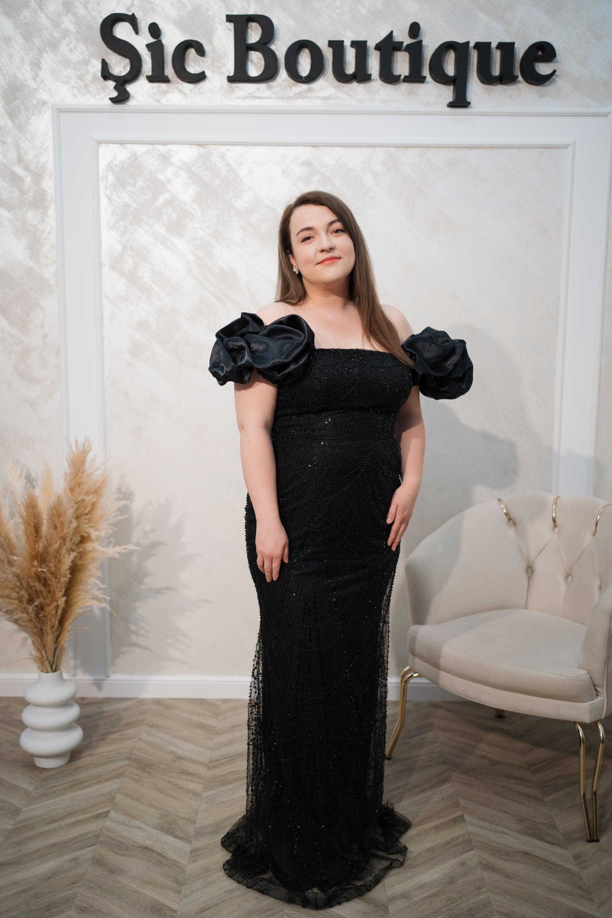 Rochie Șic – Rochie sirenă din dantelă perlată, cu corset reglabil și bretele din organza.