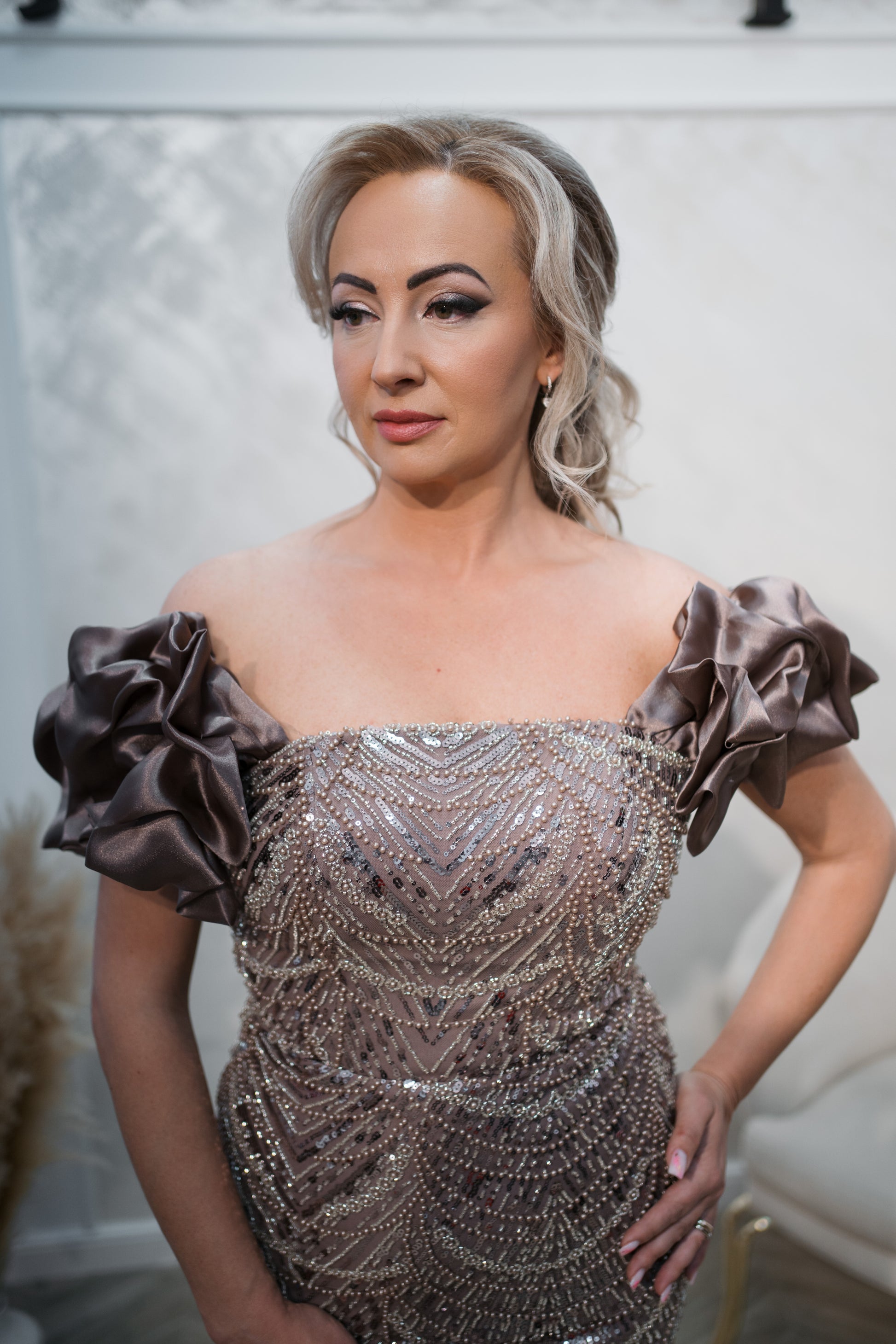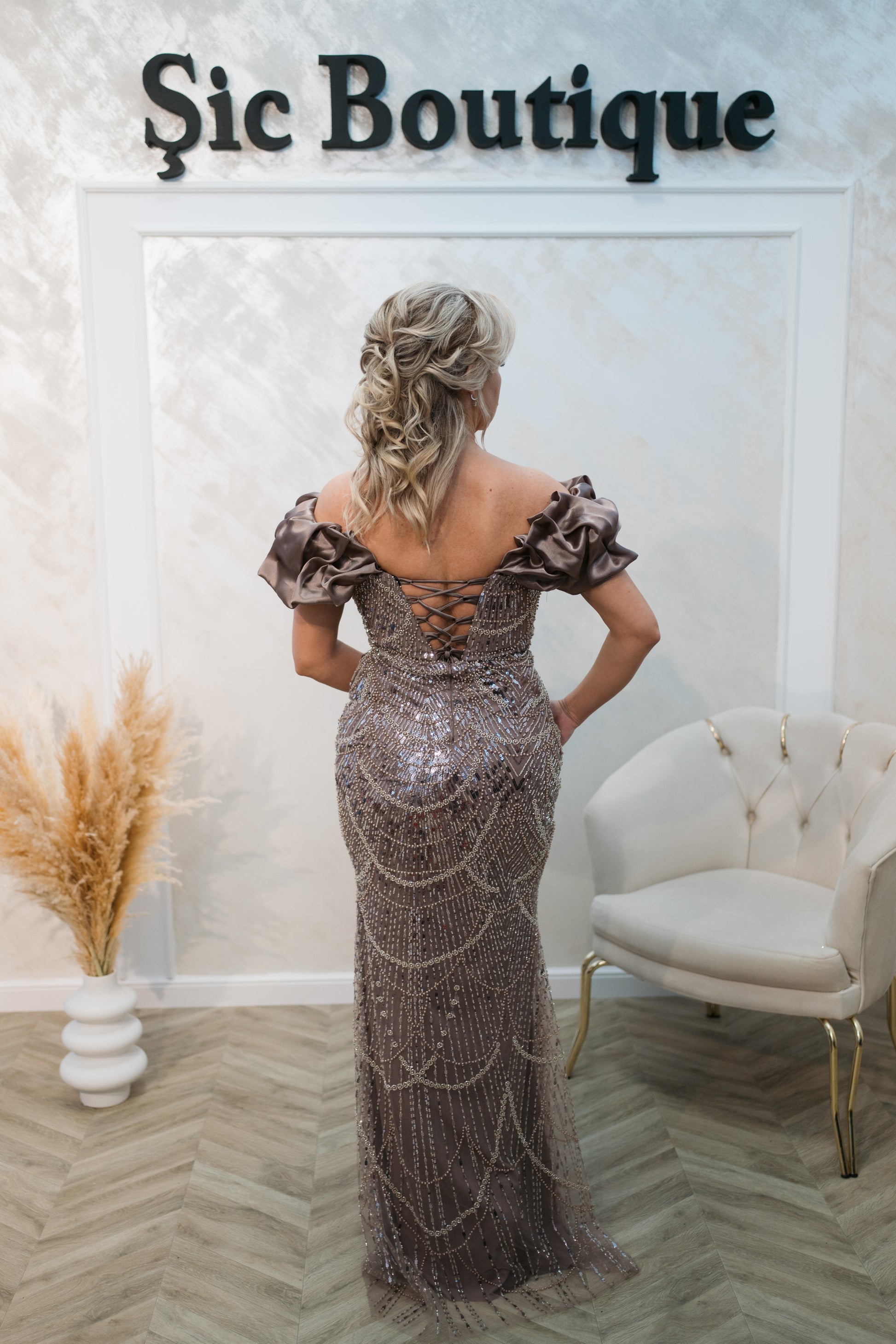 Rochia Șic îmbină rafinamentul cu funcționalitatea, punând în valoare orice siluetă. Realizată din dantelă perlată și croită în stil sirenă, această rochie are un corset reglabil ce definește armonios bustul și talia. Bretelele off-the-shoulder din organza adaugă un detaliu romantic și elegant. Perfectă pentru evenimente speciale, rochia Șic este alegerea ideală pentru nașe, soacre sau invitate.