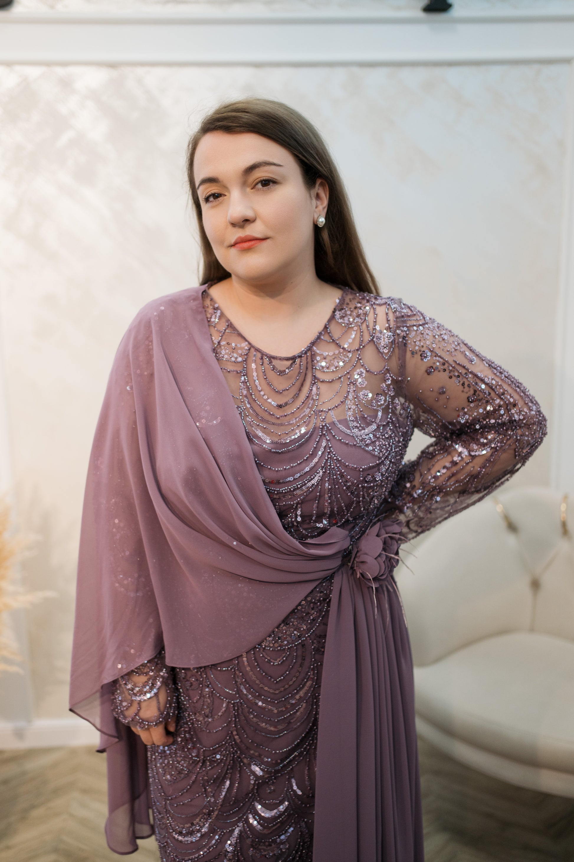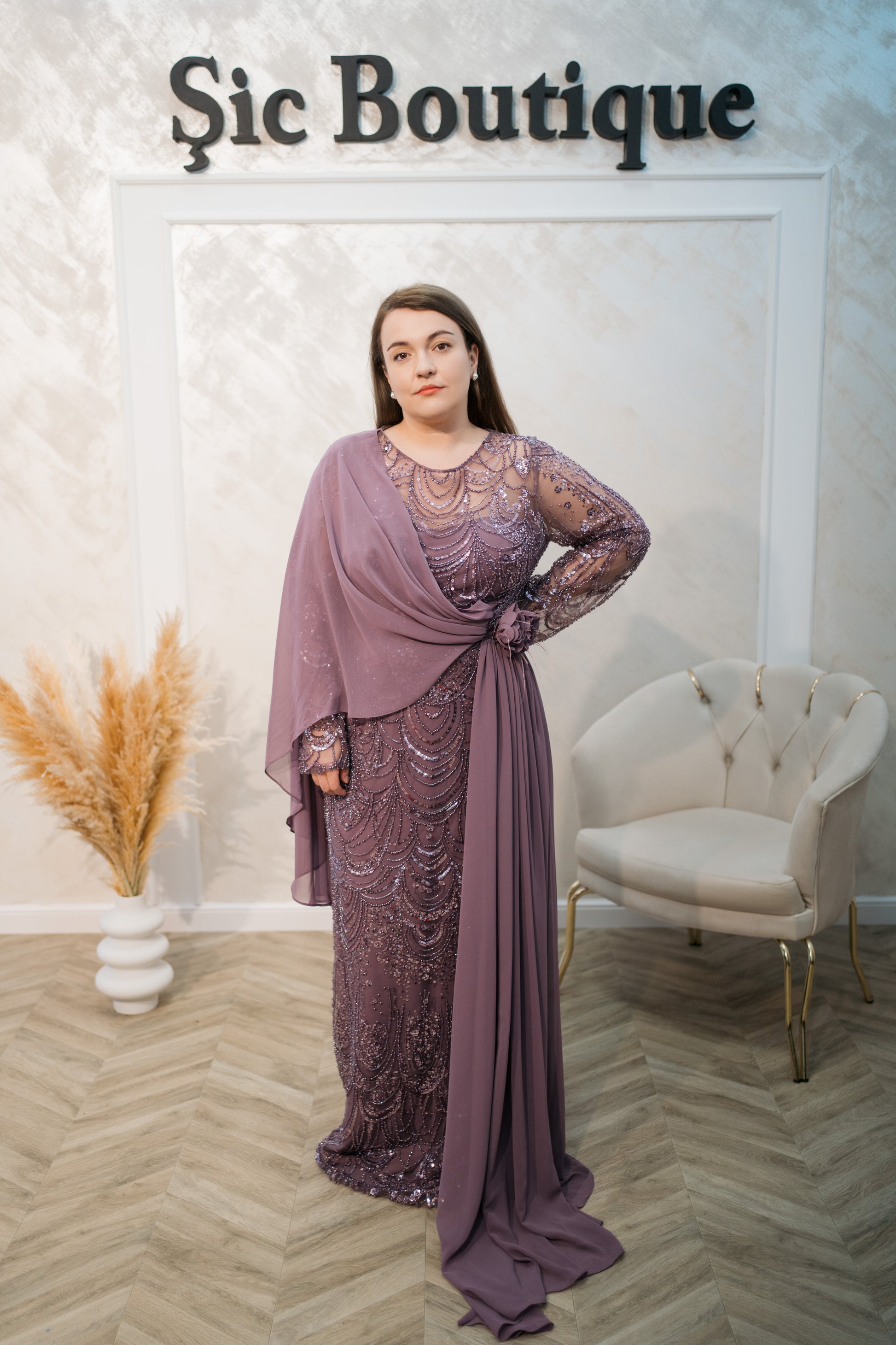 Rochia Denize – realizată din material elastic combinat cu dantelă fină, pune în valoare silueta și oferă confort. Eșarfa elegantă de pe umăr adaugă un detaliu sofisticat, iar nuanța de mov prăfuit este simbolul rafinamentului și al feminității discrete. Rochia potrivita pentru nașă sau soacră