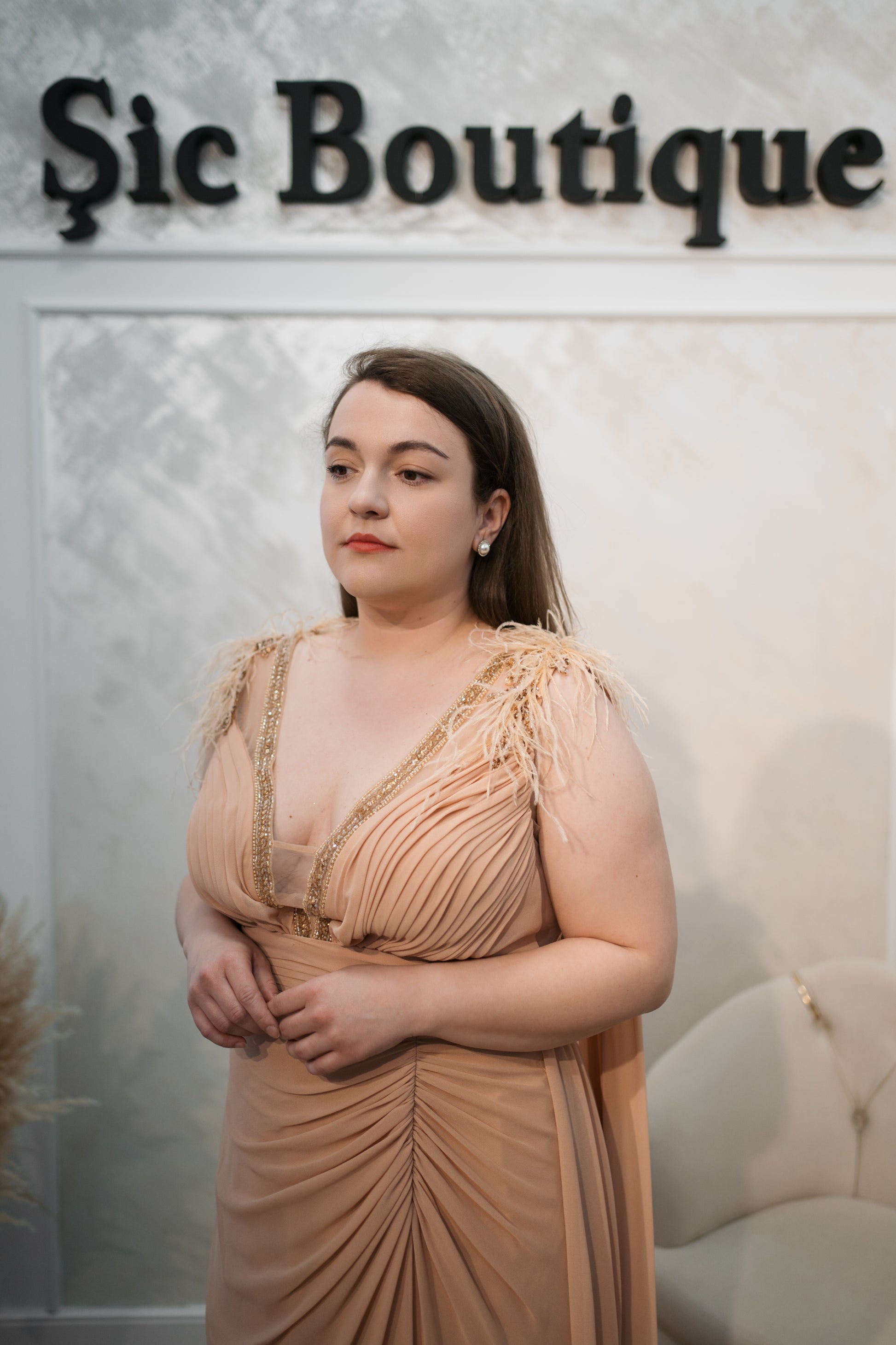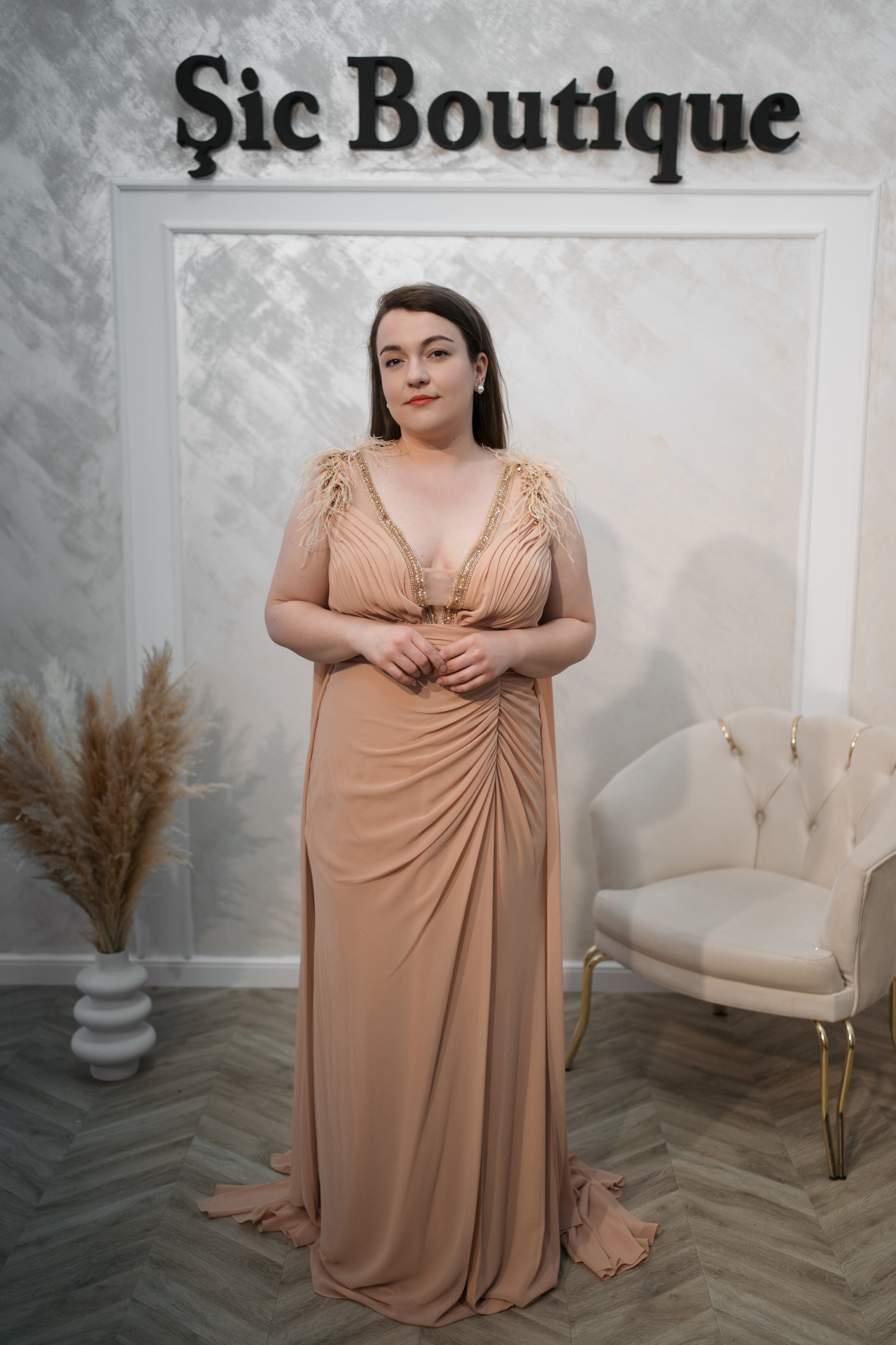 Rochia Fedra – o rochie de zeiță, realizată din voal vaporos, cu inserții de cristale și pene fine. Crepătura pe picior adaugă senzualitate, iar eșarfele prinse pe umeri oferă un aer regal. Este rochia visată de toate, dar menită doar pentru tine.