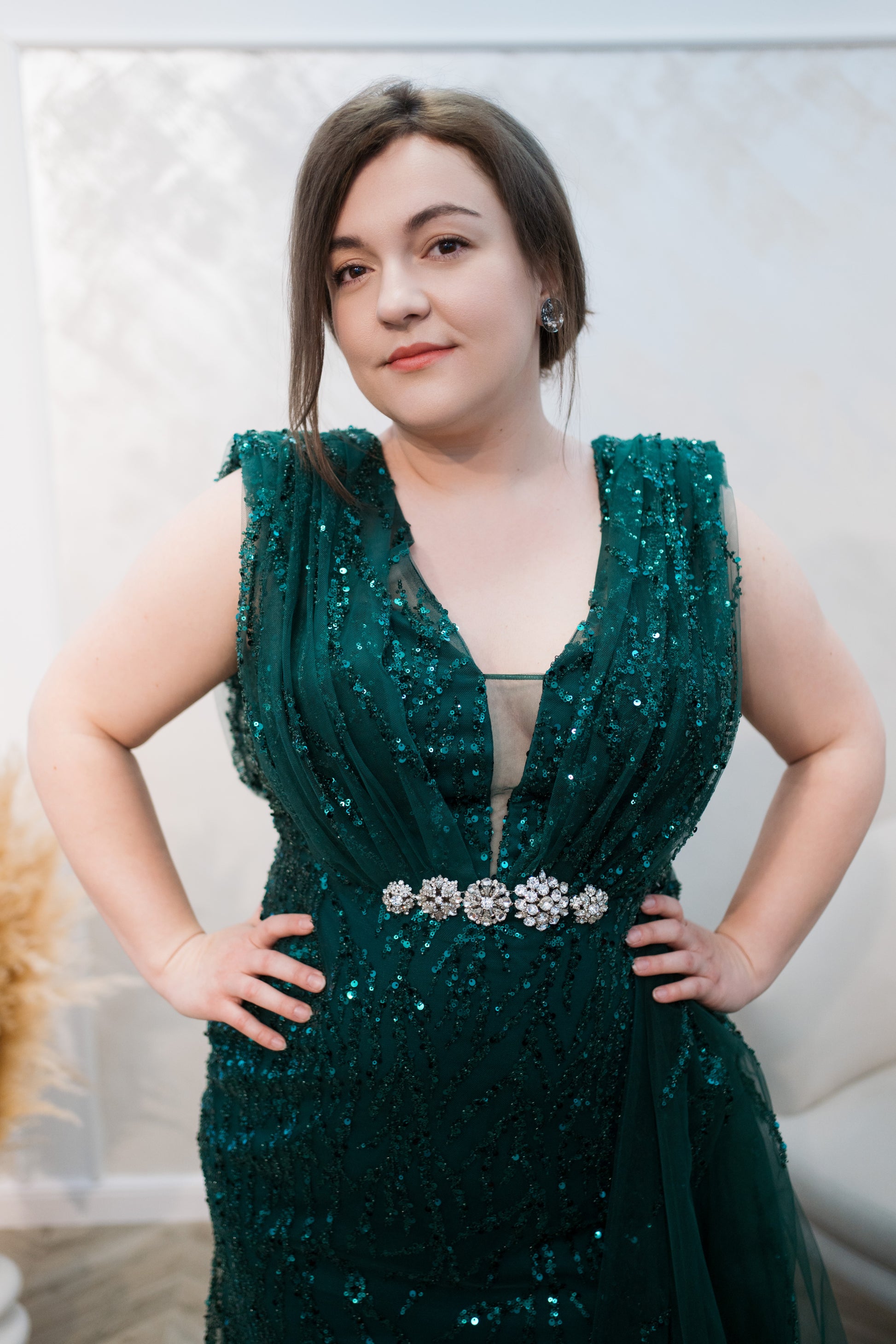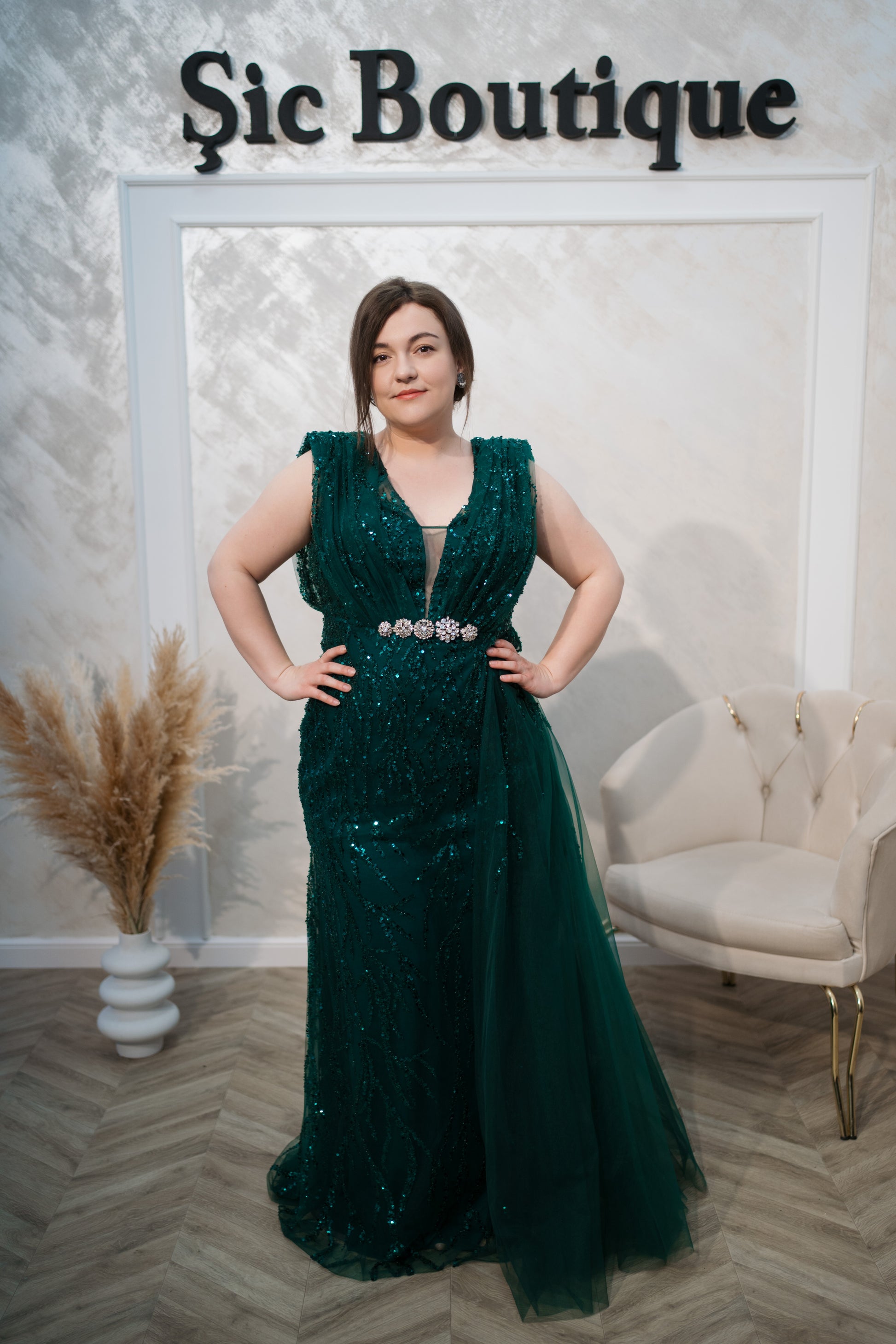 Rochia Green este un model elegant și exclusivist, cu croi godet ce pune în valoare silueta. Confecționată din dantelă fină cu paiete aplicate și completată de o trena spectaculoasă din tulle, această rochie este produsă în cantitate limitată pentru a garanta unicitatea. Alegerea ideală pentru nașe sau soacre care își doresc o apariție de neuitat, imposibil de reprodus.