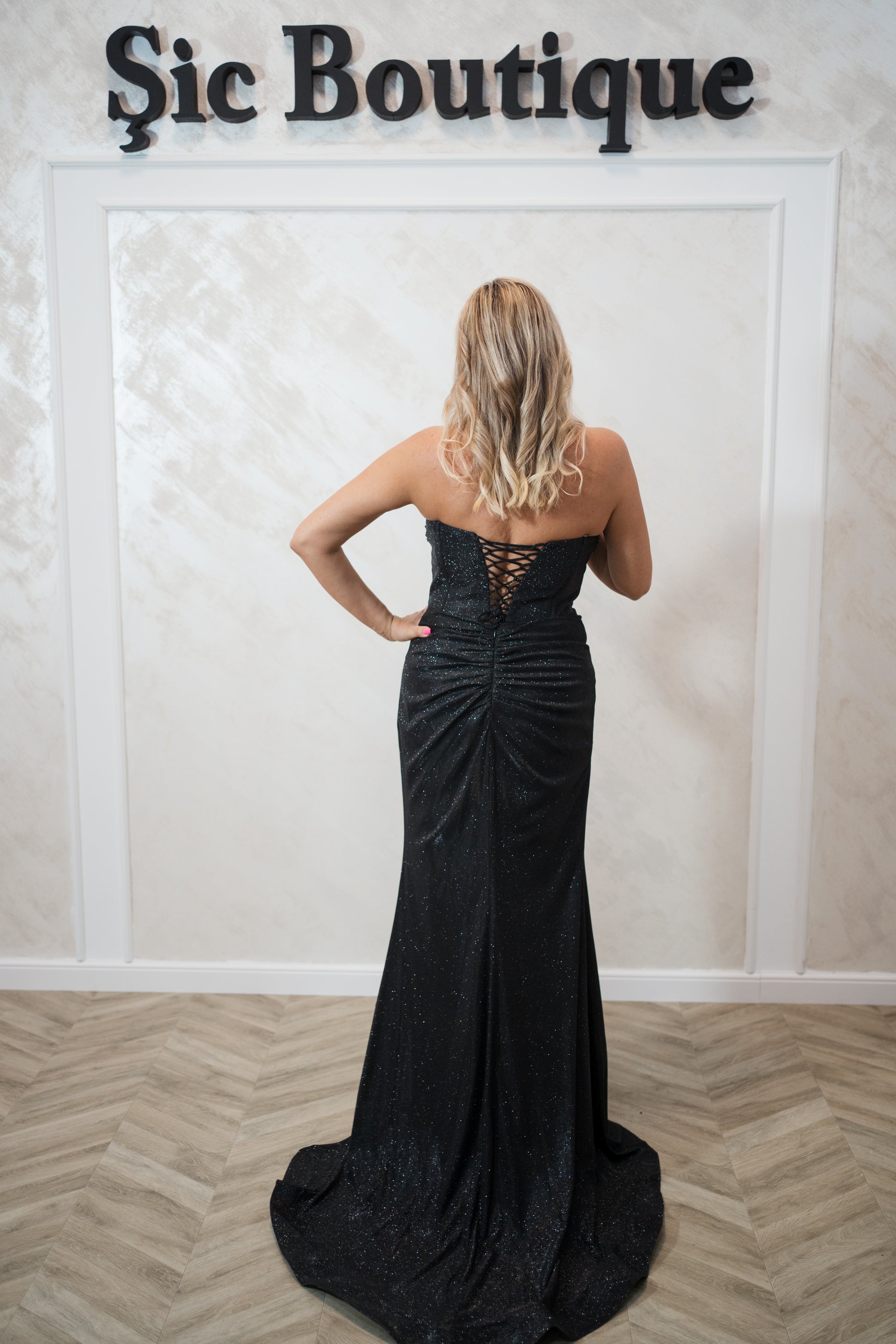 Rochia Gya-Rochie de seară neagră din lurex cu corset incrustat – eleganță cu fiecare pas