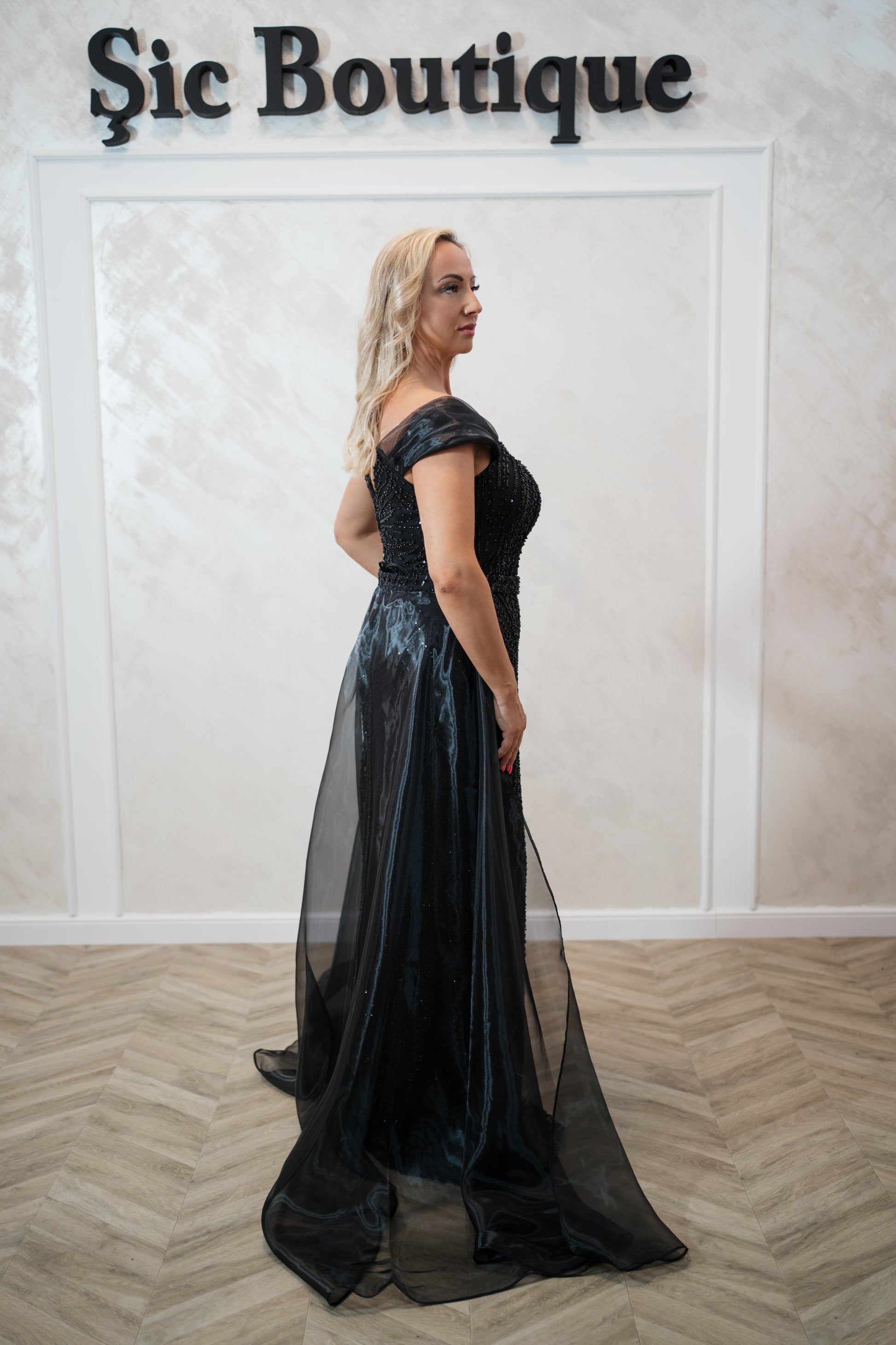 Croiul tip sirenă evidențiază silueta, iar trena din tull fin, detașabilă, oferă un efect dramatic și regal. Mânecuțele căzute conferă un aer romantic și sofisticat, ideal pentru nunți, botezuri, gale sau evenimente de gală.